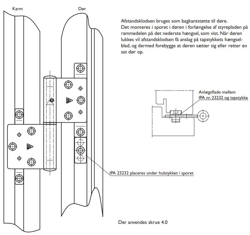 Det monteres i sporet i døren i forlængelse af styrepladen på rammedelen på det nederste hængsel, som vist. Når døren lukkes vil afstandsklodsen få anslag på tapstykkets hængselblad, og dermed forebygge at døren sætter sig eller retter en sat dør op.
